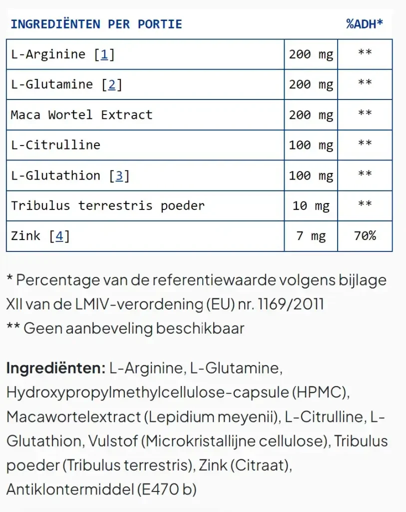 De Testonax ingrediënten zoals maca, tribulus, arginine en zink staan duidelijk vermeld. Geen verborgen toevoegingen.